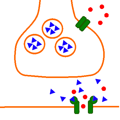Acetylcholin als Neurotransmitter (dreieckig, löst sich wieder von den transmitterabhängigen Natriumionenkanälen, die sich daraufhin wieder schließen);